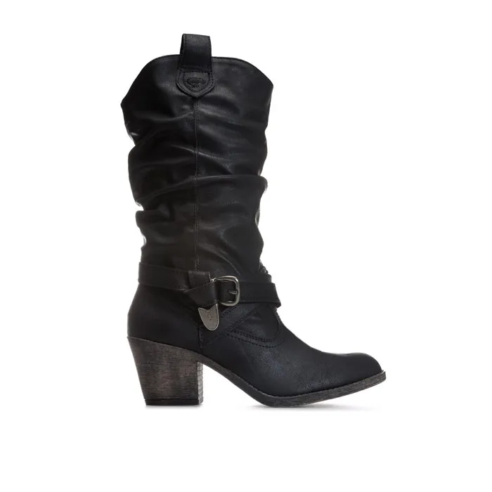 Womens Rocket Dog Sidestep Lewis Boots in black.- Calf height pull on western style boot with buckle detail.- Slouchy design.- Almond shaped toe.- Wrapped buckle detail.- Tartan lining.- Side pull-on tabs with Rocket Dog branding.- Heel height 2.5in (6.5cm) approximately.- Boot height 9.5in (24cm) approximately (back measurement).- Synthetic upper Textile lining Synthetic sole.- Ref: SIDESTEPLSMeasurements are intended for guidance only