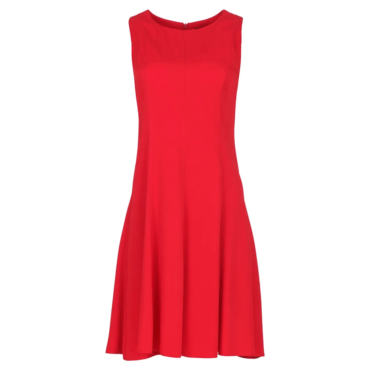Deze rode jurk is gemaakt van geweven tencel. Hij is mouwloos en heeft een ronde halslijn. Er is een verborgen ritssluiting op de rug. Verticale naden op het lichaam zorgen voor een perfecte pasvorm. De jurk is getailleerd en loopt vanaf de taille uit in een cloche-achtige rok.