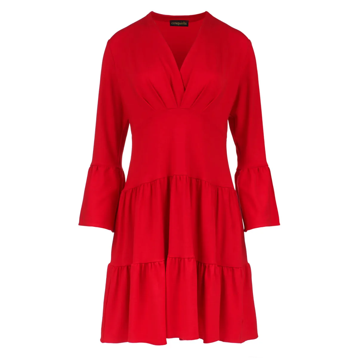 Deze zomerjurk is gemaakt van stretch jersey stof, viscose-elasthaan. Het heeft een diepe V-halslijn in een faux wrap-stijl. Het heeft bell mouwen, 7/8 lengte. Onder de buste is een gebogen zoom. De rok heeft twee lagen met ruches. De jurk valt boven de knie en is gestyled in een los A-lijn silhouet.