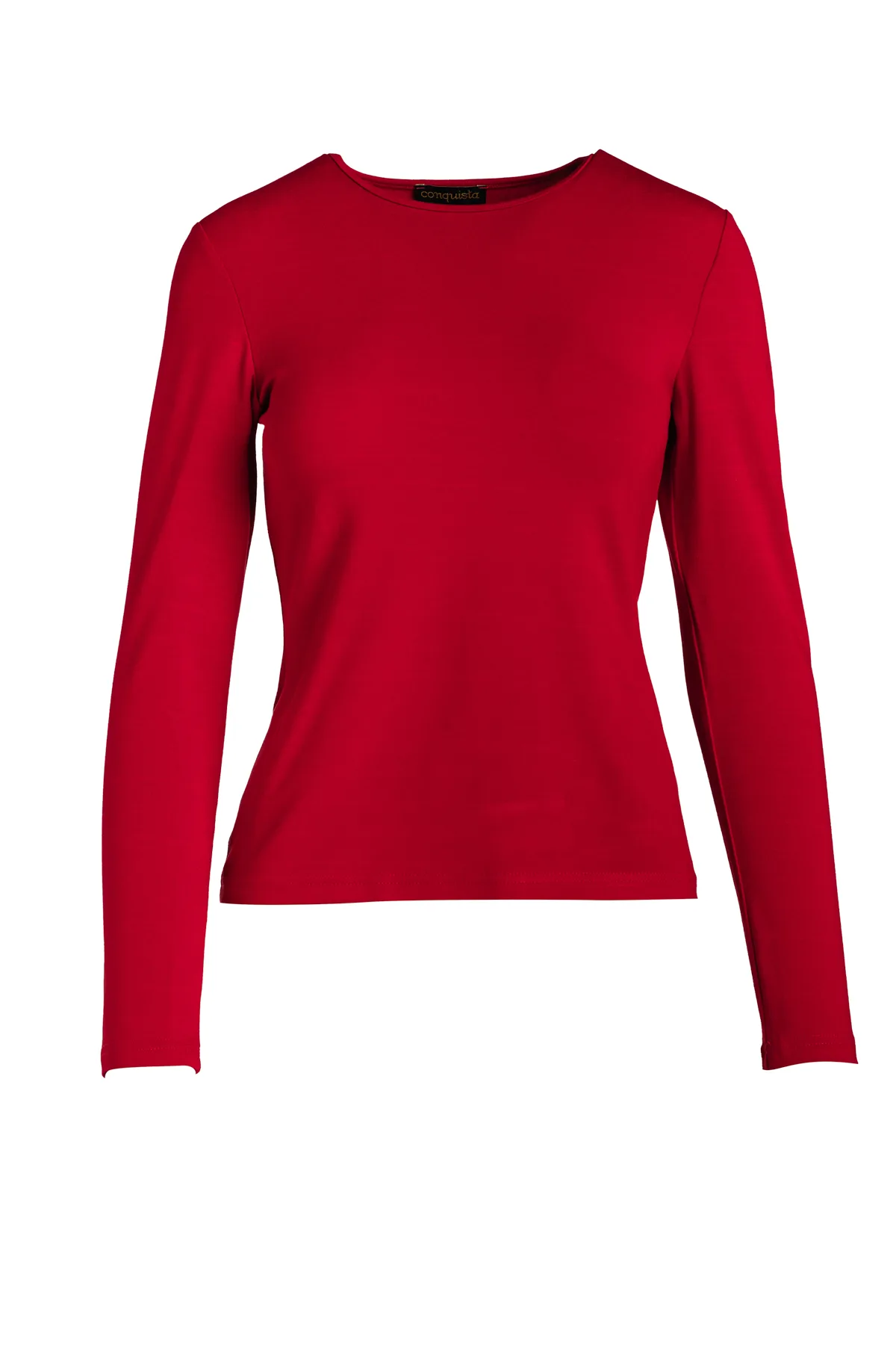 Rode jersey top. Lange mouwen en een ronde halslijn. Aansluitend. Ons model is 176 cm en draagt maat 36/S. Afmetingen voor maat 36/S (in cm): Schouder - 35, borst - 39, taille - 36, onderkant - 43, mouwlengte - 58, lichaamslengte - 56. 92% viscose - 8% elastaan. Accessoires zijn niet inbegrepen.