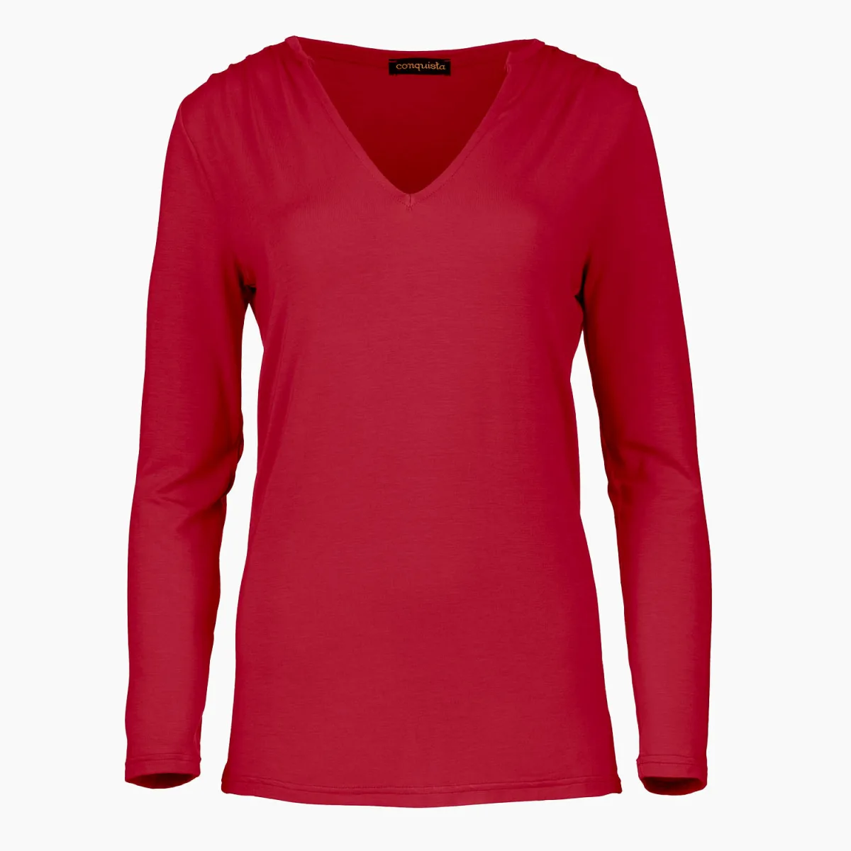 Deze rode top met lange mouwen is vervaardigd uit stretch jersey stof: micromodal-elastane. Het heeft een diepe V-halslijn, een boord aan de binnenkant van de hals en plooien aan de voor- en achterkant van de schouder. Dit kledingstuk is gestileerd in een ontspannen recht silhouet.