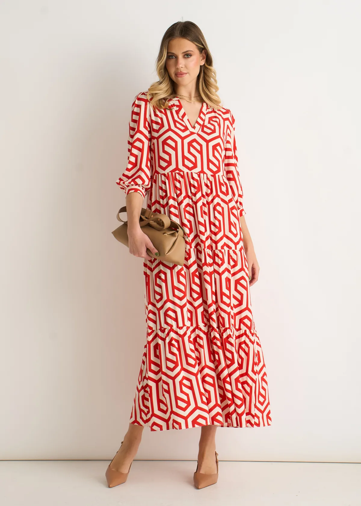 - Bij secretsales.nl kun je Rode maxi-jurk met geometrische print kopen voor slechts €33,35