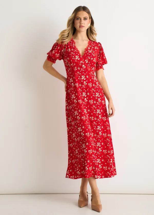 Rode viscose midi-jurk met kanten rand Prijzen