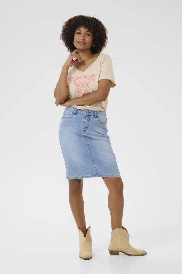 Denim rok met een rechte pasvorm, klassiek vijfzakkenontwerp, riemlussen en knoopsluiting. Knie-lengte en soepele denimlook voor een eigentijdse uitstraling.