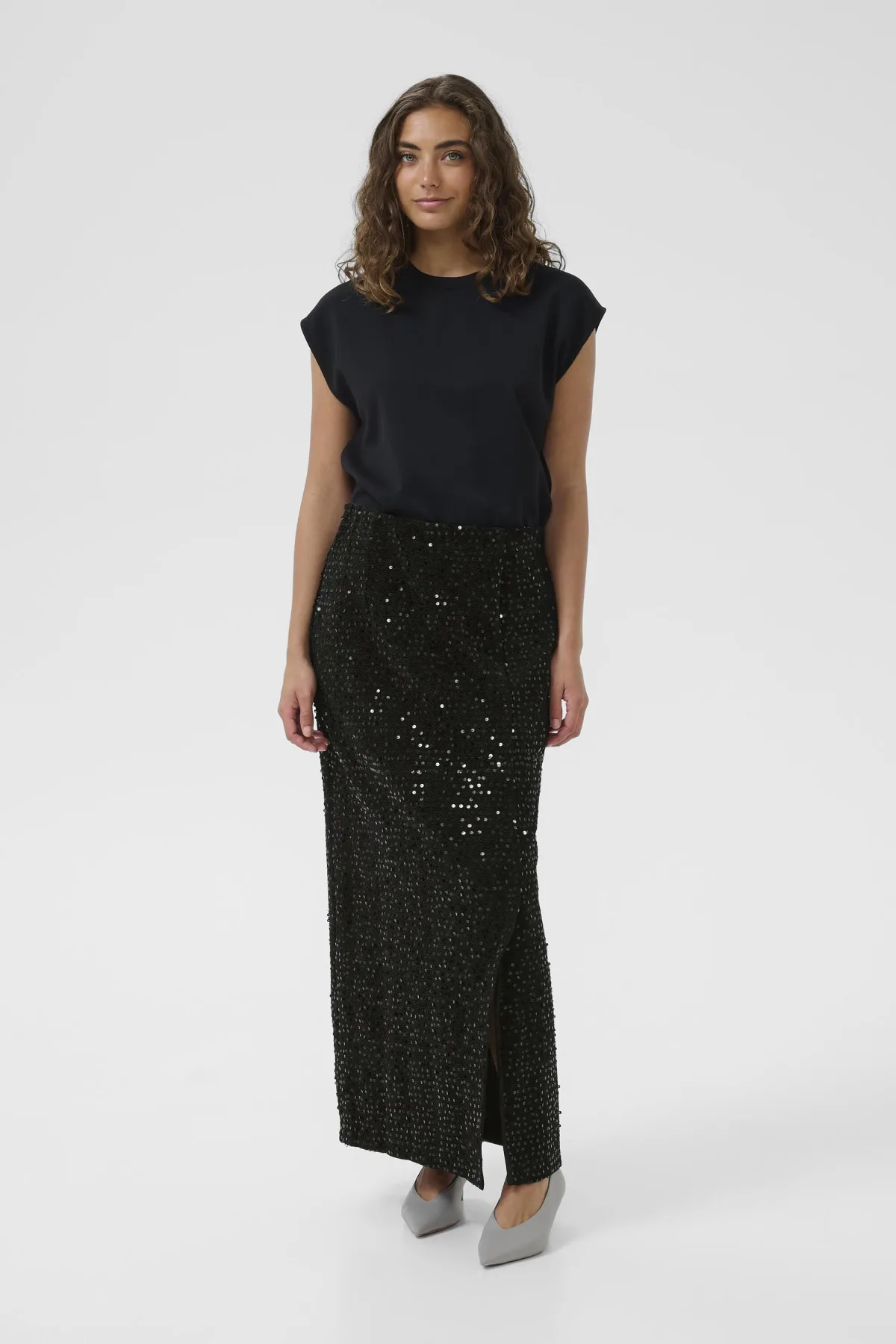 Design: Split; Motief: Effen; Rokvorm: Kokerrok; Details: Pailletten; Extra's: Glanzend; Lengte: 7/8 lengte; Pasvorm: Slanke pasvorm