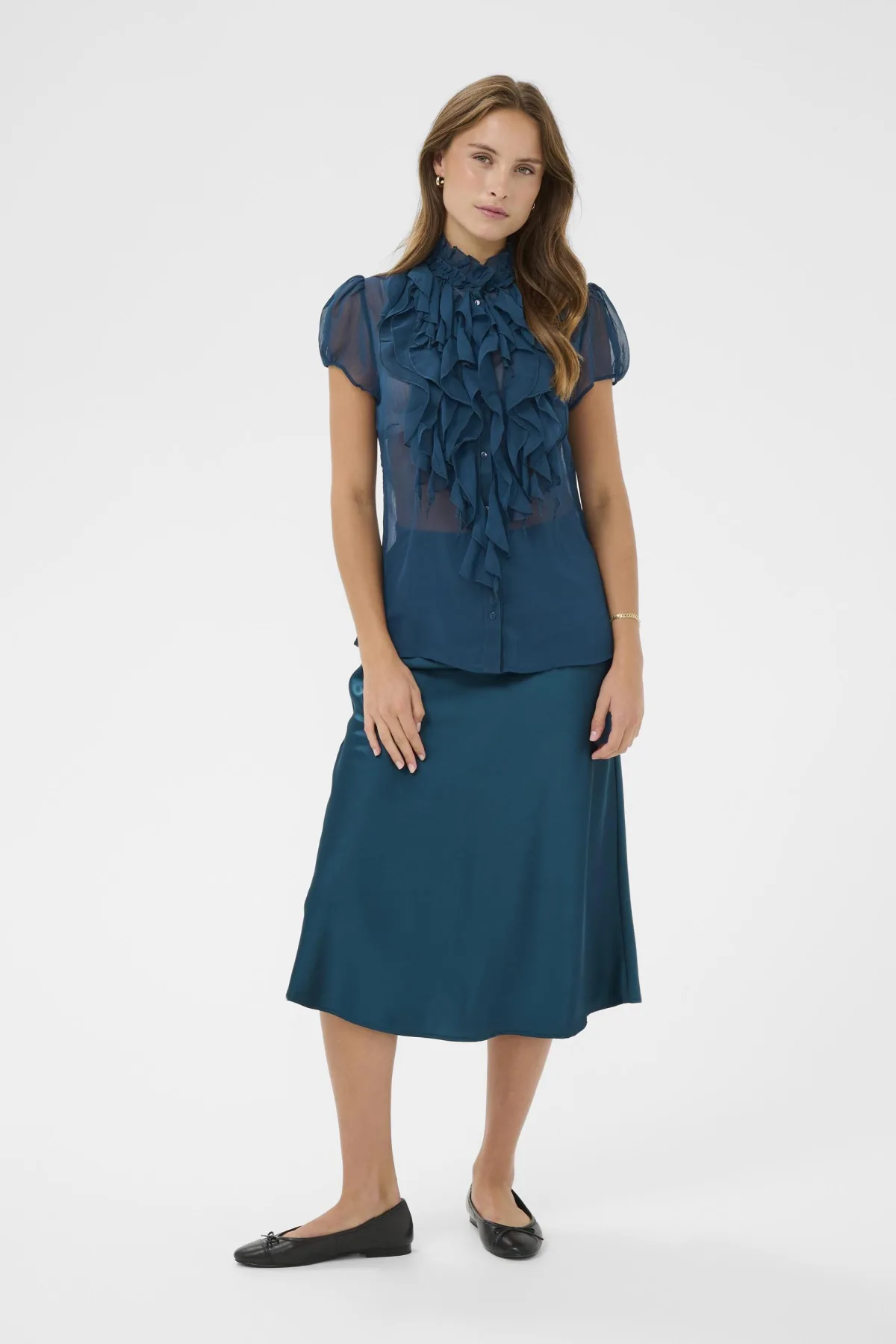 Deze dames satijnen midi-rok combineert een ontspannen pasvorm en soepele silhouet met een elastische tailleband. De midi-lengte maakt de rok geschikt voor zowel dagelijks gebruik als formele gelegenheden.