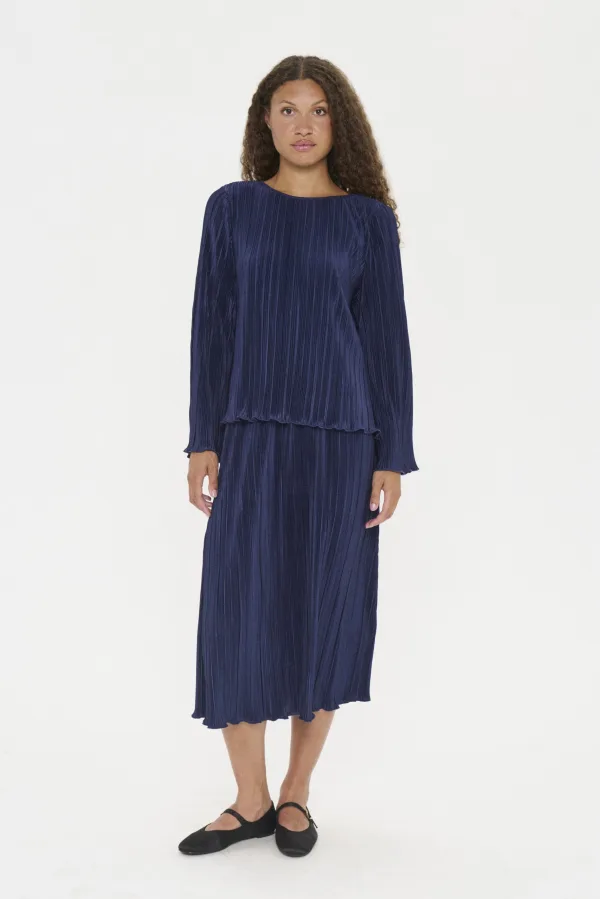 Deze plooirok op midi-lengte heeft een zachte, gestructureerde look en een elastische tailleband. Het model valt recht en valt losjes langs het lichaam.