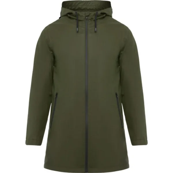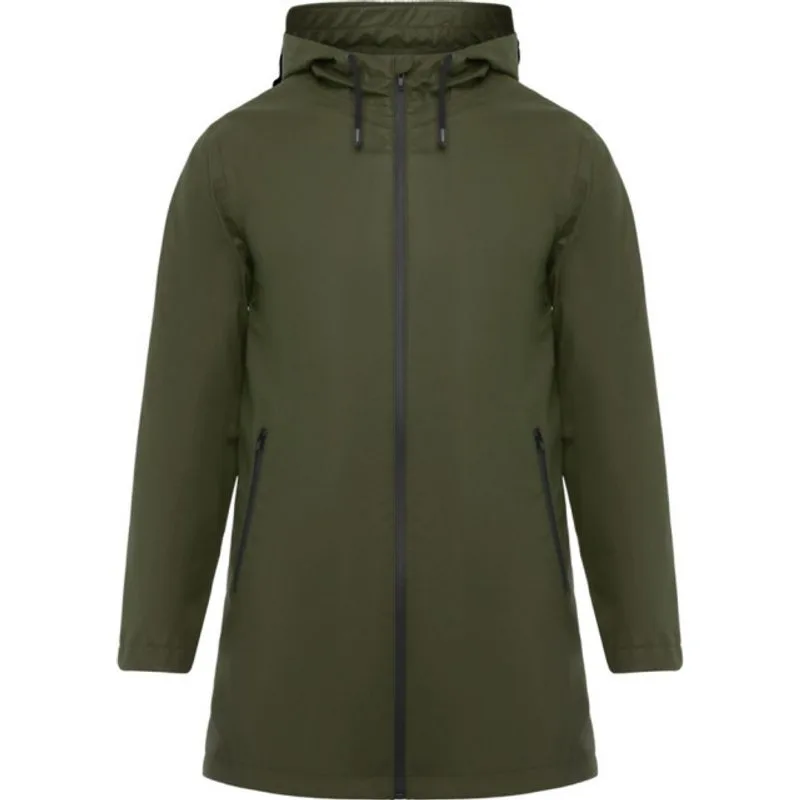Materiaal: Polyester, Polyurethaan. Ontwerp: Eenvoudig. 210gsm. Stoftechnologie: Waterdicht. Hitteverzegelde naden, hitteverzegelde ritsen, afscheurbaar label. Halslijn: Kapitein. Mouwtype: Met lange mouwen. Kapkenmerken: Trekkoord, Gegroeid op de kap, Spits. Zakken: 2 Zijzakken, Rits. Bevestiging: Volledige ritssluiting. Zoom: Split. Duurzaamheid: Oeko-Tex Standaard 100 Gecertificeerd. Verpakking: Polybag. Geschikt voor: Zeefdruk.