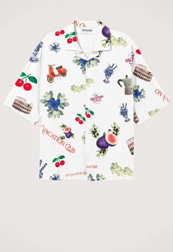Dit is het SH23 Romana Overhemd van het merk On Vacation Club. Dit overhemd heeft een relaxed pasvorm, waardoor het comfortabel aanvoelt en ideaal is voor ontspannen dagen. Het is gemaakt van 100% viscose, wat zorgt voor een zachte aanraking op je huid. Dit stijlvolle shirt beschikt over een openstaande reverskraag en een korte mouw, perfect voor warme zomerdagen. De voorkant is uitgerust met een borstzak, en het shirt heeft een all-over print die wordt aangevuld met een achterkant en mouwdecoraties voor een unieke uitstraling.