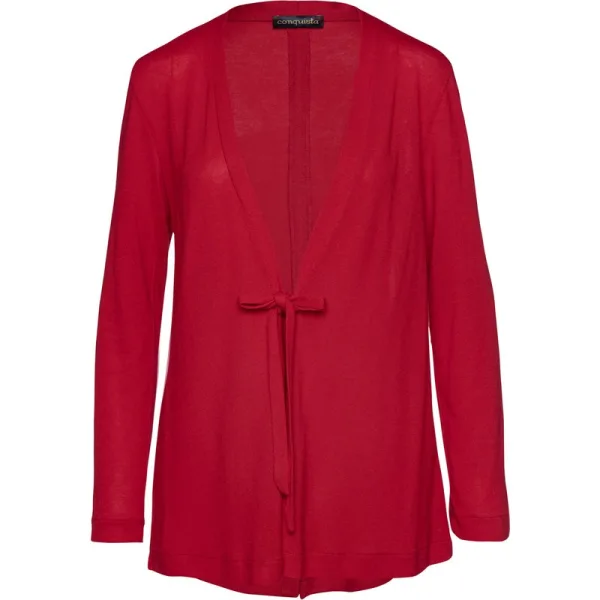 Gebreid vest met lange mouwen in rode stretchstof, 70% viscose-30% linnen. Opengewerkt met een bandje aan de voorkant van het kledingstuk. Ons model is 172cm en draagt maat 36/S. Afmetingen voor maat 38 (in cm): Schouder -39; Borst-47; Taille-50; Onderkant-69; Mouwlengte-65; Lichaamslengte-83.