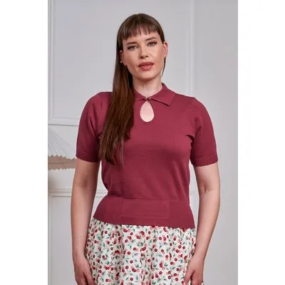 ''Made for quiet charm!'' Dit fijngebreide topje heeft een kraagje met keyhole detail, korte mouwtjes en is uitgevoerd in een zachte en stretchy, 100% katoen in bordeauxrood die heerlijk draagt. * Kraagje * Keyhole detail met haaksluiting en sierknoopjes * Korte mouwtjes * Stretchy ribboorden * Lang genoeg om op een mid-waist broek of rok te dragen
