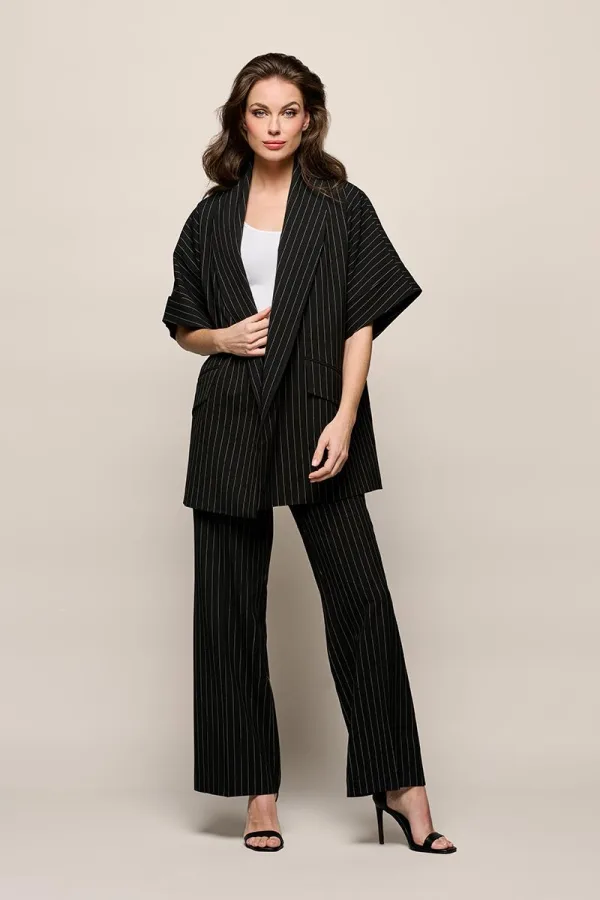 Zwart-witte krijtstreep kimono blazer met eigentijdse fitDe Roseline blazer in zwart met een fijne witte krijtstreep is een opvallend item met een moderne en krachtige uitstraling. De kimono-geïnspireerde snit in combinatie met de elegante overslag en het strikceintuur zorgt voor een vrouwelijk silhouet met een modieuze twist. De klassieke krijtstreep vormt een tijdloze basis, terwijl de losse vorm en ceintuur de blazer een eigentijds karakter geven.Dankzij de licht oversized pasvorm valt de blazer soepel en oogt hij nonchalant, maar blijft de uitstraling verzorgd en stijlvol. De fit biedt veel bewegingsvrijheid en maakt het item eenvoudig te combineren met uiteenlopende outfits en silhouetten. De blazer is uitgevoerd in een comfortabele stretchkwaliteit van 63% polyester, 34% viscose en 3% elastaan, wat zorgt voor een zachte feel, lichte rek en een vormvaste pasvorm. De voering van 100% polyester verhoogt het draagcomfort en zorgt voor een nette afwerking.