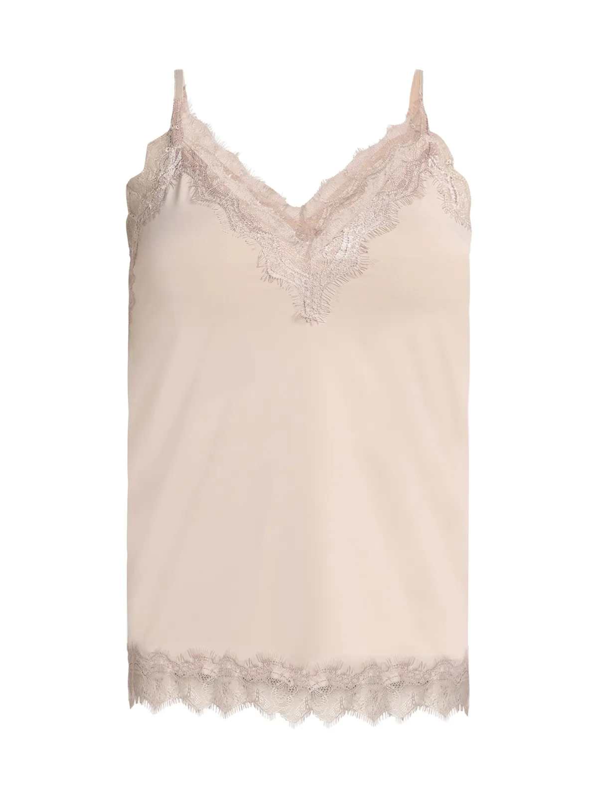 Blouse type: Blouseshirt; Design: Gefranjerde zoom, Zoom/rand met boord; Materiaal: Jersey; Halstype: V-hals; Motief: Effen; Kraag: Zonder kraag; Soort bandjes: Spaghettibandjes; Details: Kant; Extra's: Verstelbare bandjes, Lichte stof; Pasvorm: Normale pasvorm; Armlengte: Mouwloos; Lengte: Normale lengte