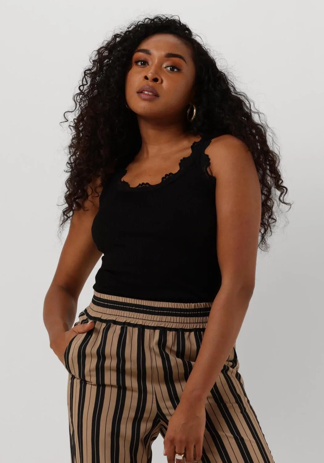 Design: Geribbeld gebreid, Gerolde boord, Diepe snit/decolleté; Materiaal: Jersey; Halstype: Ronde hals; Motief: Effen; Soort bandjes: Normale bandjes; Details: Kant; Extra's: Op staal naden, Met textuur; Pasvorm: Slanke pasvorm; Armlengte: Mouwloos; Lengte: Normale lengte