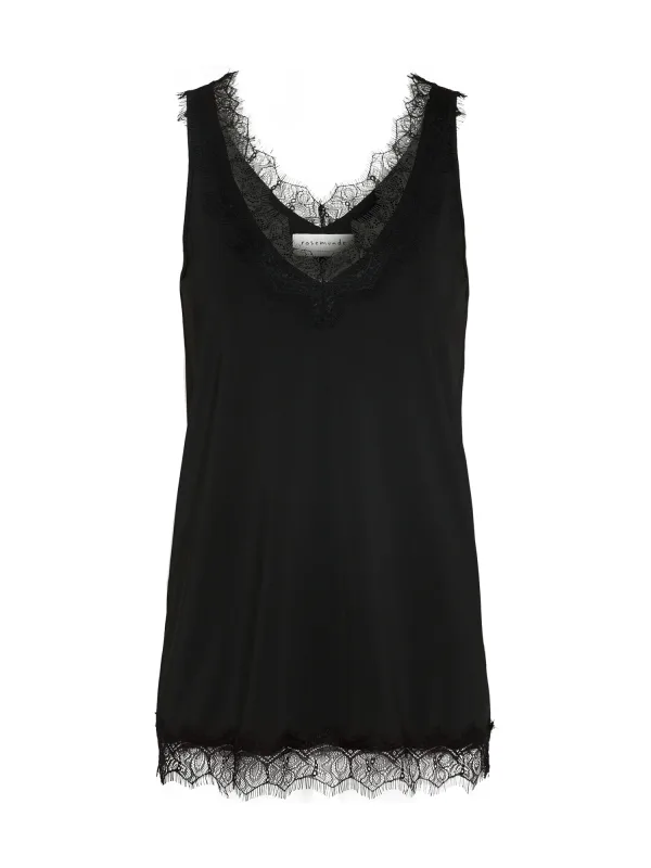 Blouse type: Blouseshirt; Design: Zoom/rand met boord; Materiaal: Jersey; Halstype: V-hals; Motief: Effen; Kraag: Zonder kraag; Soort bandjes: Normale bandjes; Details: Kant; Extra's: Buigzame grip; Pasvorm: Normale pasvorm; Armlengte: Mouwloos; Lengte: Normale lengte