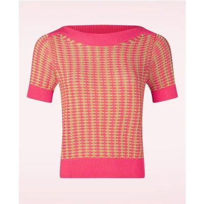 ''Color therapy, but make it knit.” Deze vrolijke knitted cutie is een echte musthave! Ze heeft een elegante boothals, korte mouwtjes en een speels patroon in roze en groen dat elke look direct een frisse touch geeft. Ze is uitgevoerd in een fijngebreide, soepelvallende viscosemix die heerlijk comfortabel draagt. * Boothals * Korte mouwen * Lang genoeg om op een normale heupbroek te dragen