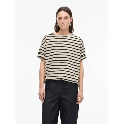 Ga voor een praktische basic met dit ROUGE EDIT dames T-shirt Rounima. Het shirt heeft een rechtvallende pasvorm en een ronde hals, waardoor het moeiteloos combineerbaar is met je favoriete jeans, pantalon of rokje. Dankzij de korte mouwen en de frisse streepprint is dit T-shirt een praktische optie voor zowel werk als vrije tijd. Gemaakt van 100% katoen voelt het zacht aan op de huid en is het geschikt voor dagelijks gebruik.Details die je elke dag draagt Rechtvallende pasvorm voor een relaxed silhouet zonder strak gevoel Korte mouwen met rechte inzet voor een rustige, moderne look Ronde hals die mooi aansluit zonder te hoog te zitten Gemaakt van 100% katoen voor een zachte en ademende kwaliteit Streepprint die gemakkelijk combineert met effen items Geen borstzak, waardoor het design rustig en clean oogt Maatadvies: valt normaal, kies gewoon je gebruikelijke maatAltijd goed in je dagelijkse garderobeDit T-shirt is geschikt als basislaag onder een blazer of vest, maar komt ook goed tot zijn recht solo op een jeans of short. De streepprint geeft extra karakter, terwijl het model eenvoudig blijft, zodat je het op veel manieren kunt dragen.ROUGE EDIT, moderne essentialsROUGE EDIT richt zich op eigentijdse essentials die makkelijk te combineren zijn. De ontwerpen volgen de trends, maar blijven draagbaar en praktisch voor elke dag. Zo vul je je kast met stukken waar je vaak naar grijpt en die langdurig inzetbaar zijn in je garderobe.Een T-shirt dat zonder moeite in je dagelijkse outfits past.