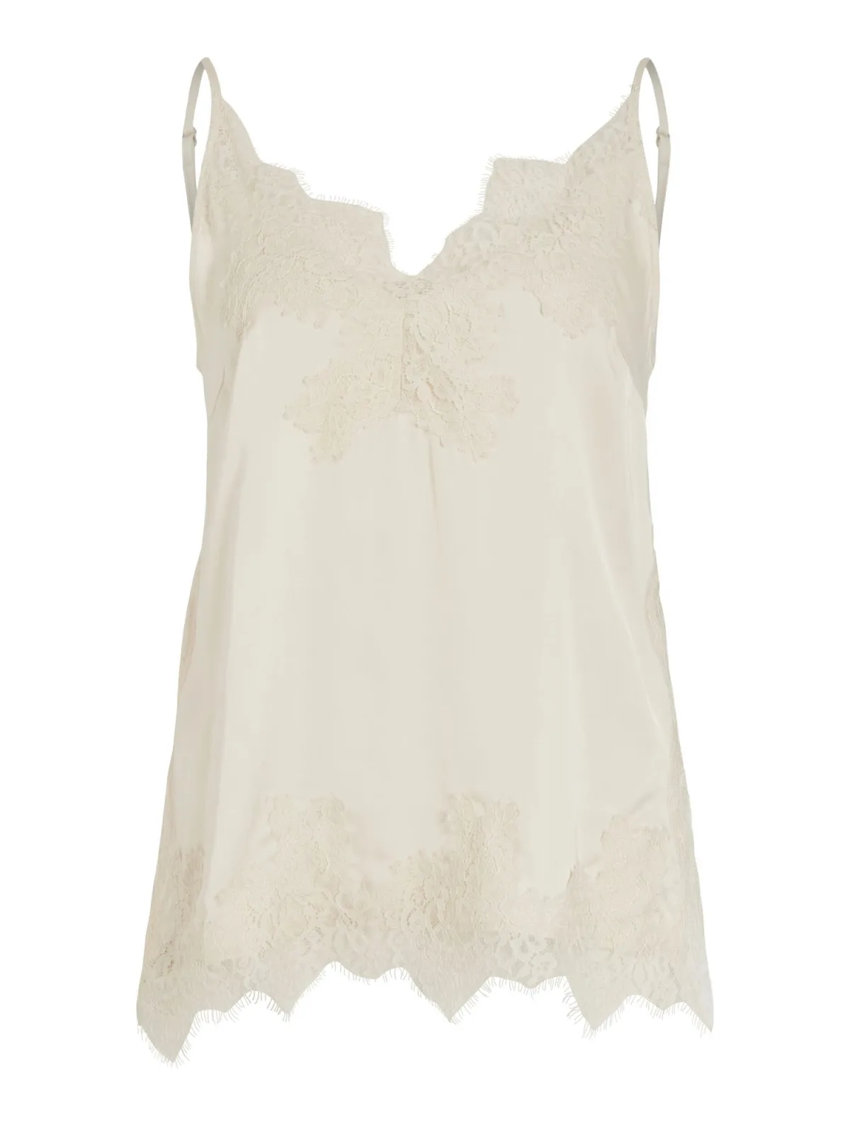Design: Geschulpte zoom; Materiaal: Viscose; Halstype: V-hals; Soort bandjes: Spaghettibandjes; Details: Kant; Extra's: Verstelbare bandjes, Gladde stof; Pasvorm: Normale pasvorm; Armlengte: Mouwloos; Lengte: Normale lengte