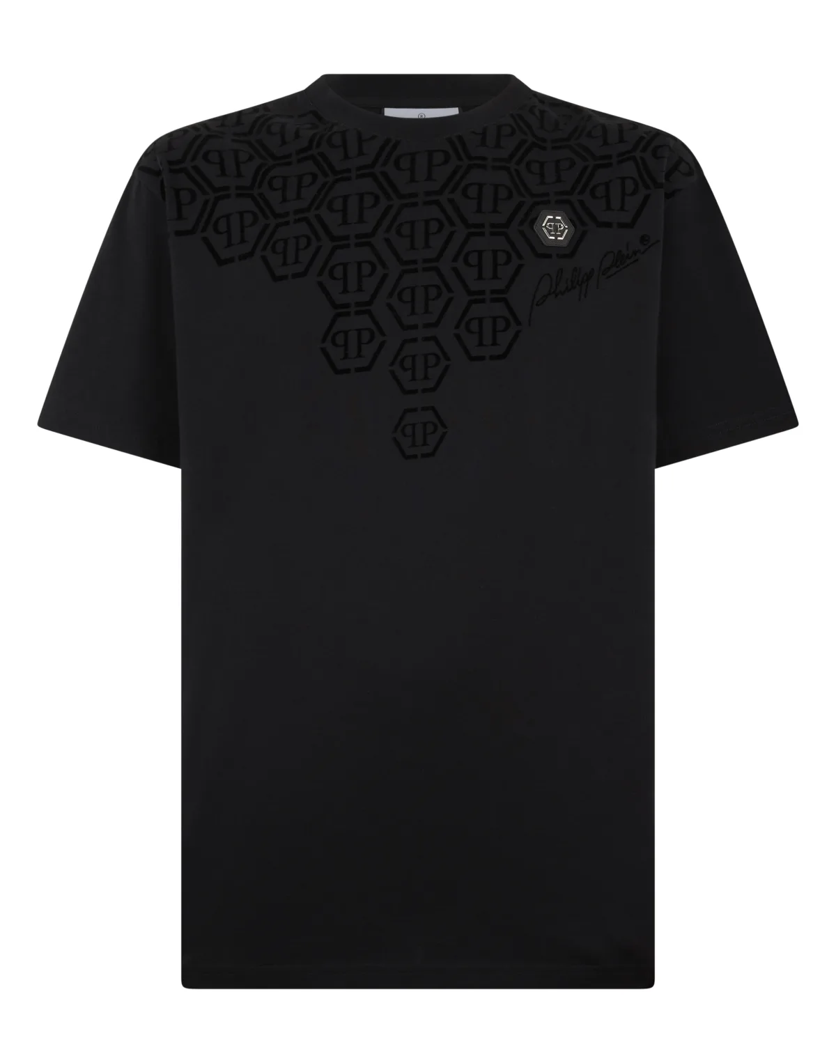 Een gewoon T-shirt kan een must-have kledingstuk worden. Kijk naar de details. Katoenen jersey Monogrampatroon gevlokt op de voor- en achterkant Opgenaaide patch met logo op de linkerborst Ribgebreide hals Stiksels met twee naalden