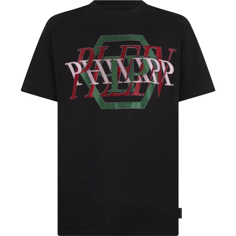 A plain T-shirt can become a must-have garment. Look at the details. Cotton jersey Rhinestoned pattern print on the front Logoed patch sewn on the yoke Rib knit neckline Two needle stitching