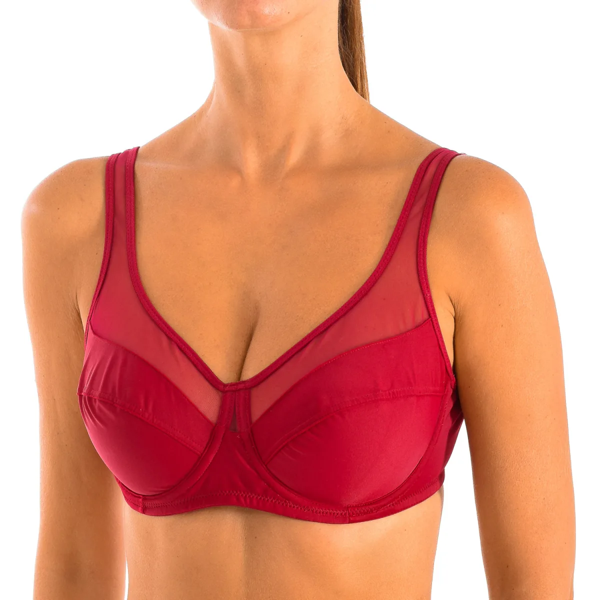Beugel-bh Cups zonder schuim. Lycra cups, met chiffon detail aan de bovenkant. Elastische en verstelbare bandjes. Rugsluiting met haakjes in drie standen. Elastische zijkanten, met verstevigende staafjes. Naden in toon zichtbaar. Samenstelling: 75% Polyamide, 25% Elastaan Onderhoud: Wassen op max. temperatuur 40º. - Geen bleekmiddel gebruiken. - Niet in de droger. - Niet strijken. - Niet chemisch reinigen.