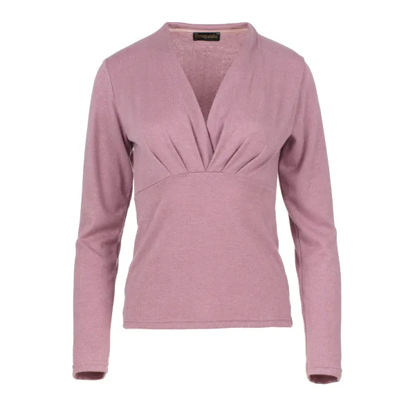 Deze roze gemêleerde top is gemaakt van gebreide stof. Het heeft lange mouwen met een faux overslag aan de voorkant waardoor een diepe V-hals ontstaat. Onder de buste loopt een naad. De lengte voor maat 36/S is 32cm.