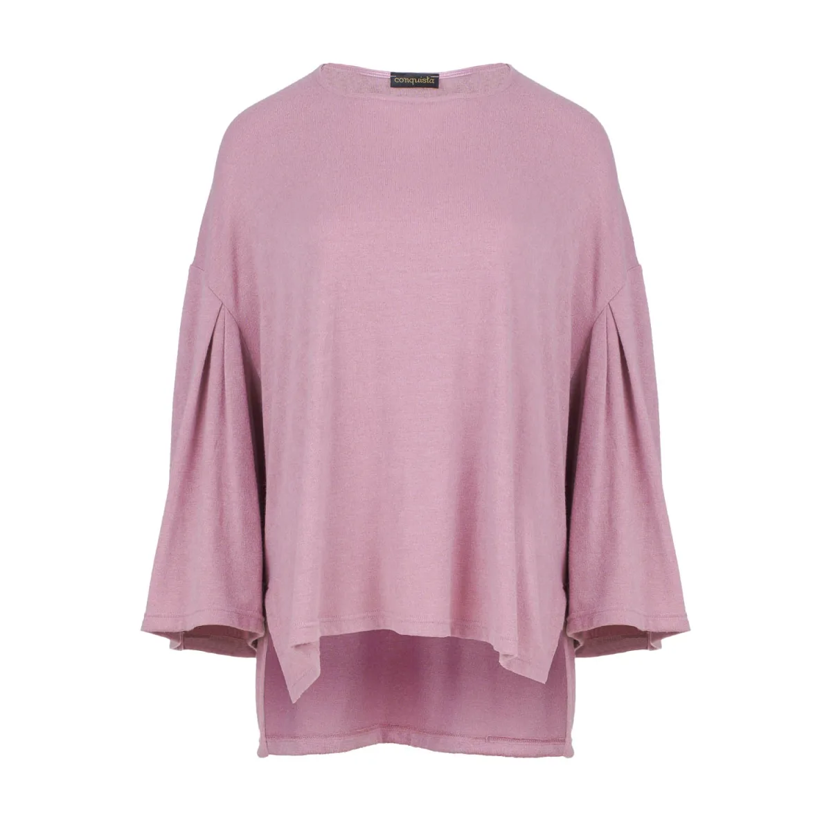 Deze roze top is gemaakt van gebreide stof. Het heeft een ronde halslijn en lange wijde klokmouwen. Op de mouwen zitten twee omgekeerde plooien voor en achter. De ongelijke zoomlijn is korter aan de voorkant. De top heeft een losse, relaxte pasvorm.