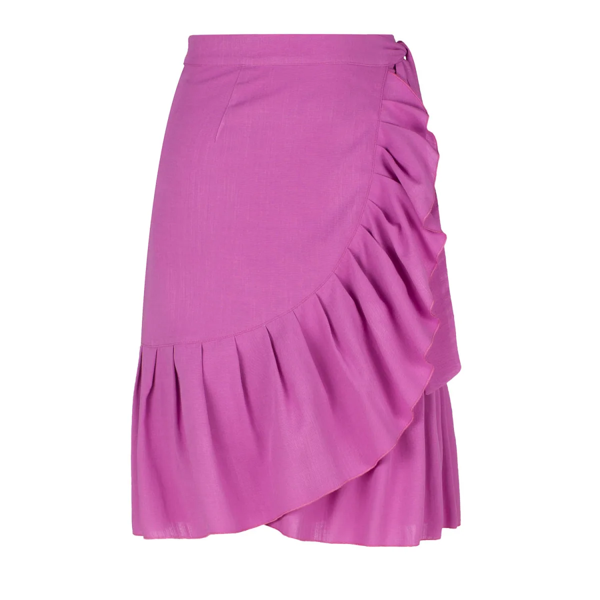Deze roze wikkelrok is gemaakt van geweven linnen stof. De rok wordt gesloten met een bandje van 4,5 cm in dezelfde stof dat door een gaatje in de zijnaad net onder de tailleband gaat. De rok heeft een 26 cm lange ruche. De rok heeft een subtiel A-lijn silhouet en is knielang.