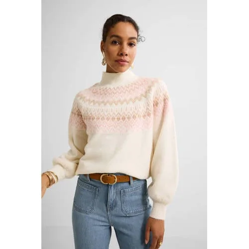 Deze trui voor dames van Ruby is gemaakt van een polyestermix. De trui heeft een opstaande kraag en lange mouwen. In de stof is een fairisle breipatroon verwerkt. Ideaal voor de koude dagen.Details van deze trui:• gebreid• lange mouwen• opstaande kraag• ingebreid fairisle patroon• geribde hals, boord en zoom