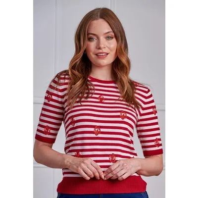 “Lobster love.” Deze comfy knitted cutie Ruby heeft een hoge halslijn, korte mouwtjes en een vrolijke strepenprint met speelse geborduurde kreeften. Ze is uitgevoerd in een heerlijk soepele, fijngebreide en stretchy viscosemix in rood en roze, waardoor ze supercomfortabel draagt. * Hoge halslijn * Korte mouwtjes * Stretchy ribboord * Lang genoeg om op een normale heupbroek te dragen