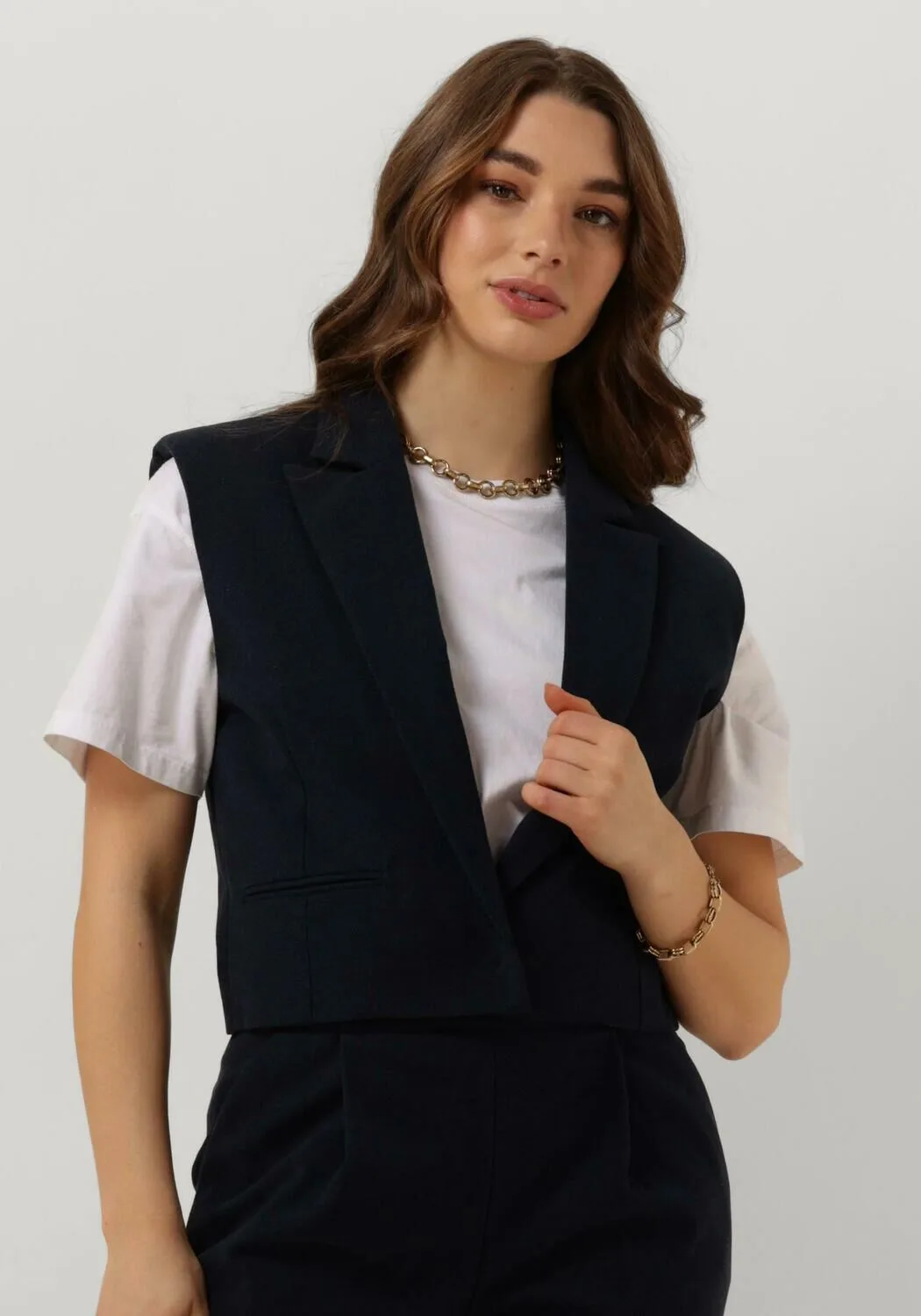 Maak je outfit compleet met de RELIN CROPPED WAISTCOAT van RUBY TUESDAY. Dit donkerblauwe gilet is perfect voor een stijlvolle look. Draag het over een witte blouse voor een zakelijke uitstraling of combineer het met een basic t-shirt voor een casual look. Met dit item kun je zowel naar kantoor als naar een feestje. Voeg wat extra flair toe aan je garderobe met dit trendy gilet.