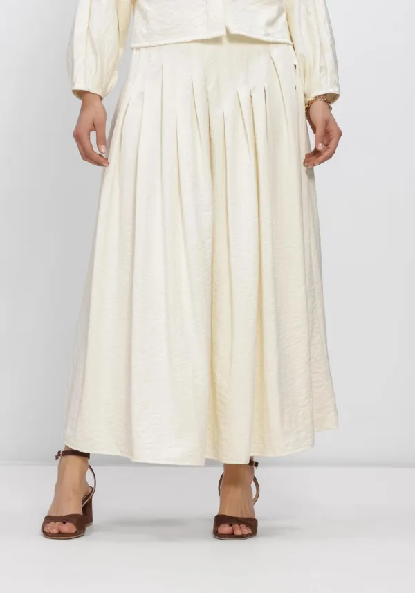 Ontdek de charme van de CANSU maxirok van RUBY TUESDAY. Deze gebroken witte plissé rok is perfect voor zonnige lentedagen en warme zomermiddagen. Flaneer langs de boulevard of geniet van een picknick in het park met deze elegante rok. Combineer hem met een luchtige blouse of een casual T-shirt voor een moeiteloze look. De subtiele plooien geven een speelse touch, terwijl de lichte kleur zorgt voor een frisse uitstraling. Ideaal voor dames die houden van stijl en comfort. Voeg een paar sandalen toe en je bent klaar voor elke zomerse gelegenheid.