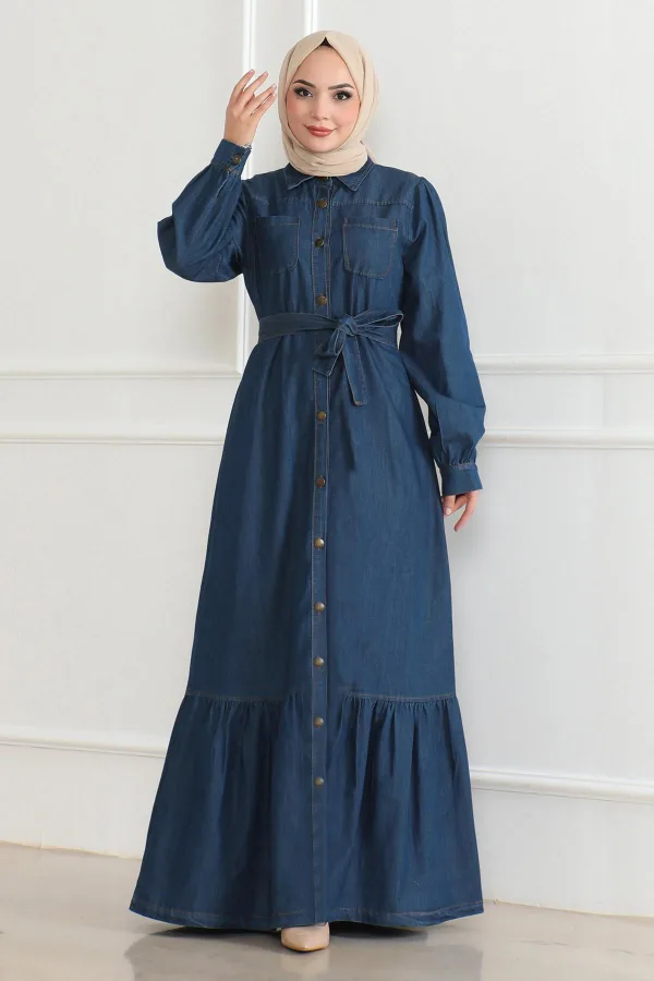 Stofkenmerk: Gemaakt van denimstof. Productkenmerk: Nieuwe seizoenshijabmode. Ongevoerd. Voorkantknopen zijn aanwezig. Manchetknopen zijn actief. Twee zakken op de borst. Afneembare riem. Productkleur kan variëren door conceptfoto’s. Het model draagt maat 38. De maattabel is te vinden in de foto’s.