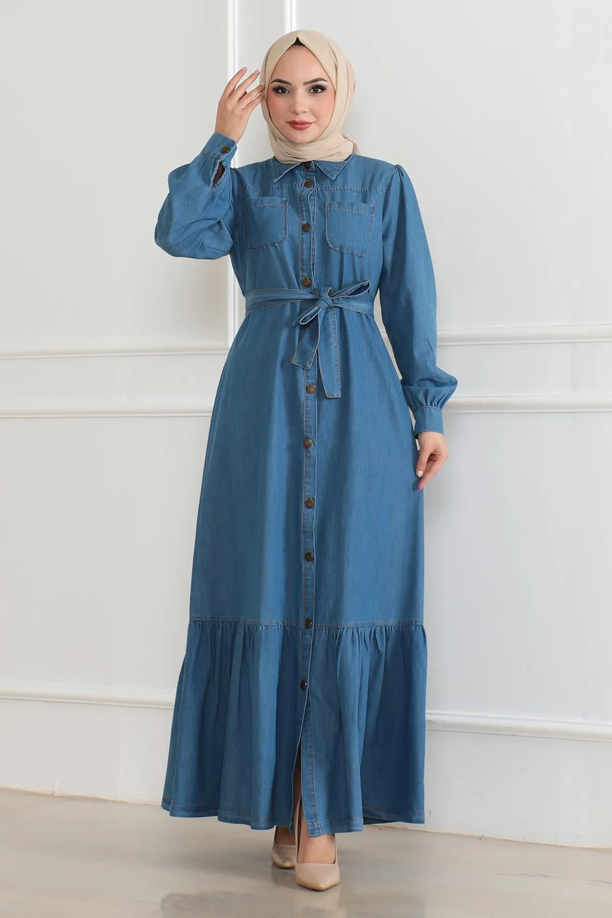 Stofkenmerk: Gemaakt van denimstof. Productkenmerk: Nieuwe seizoens hijabmode product. Niet gevoerd. Voorknopen zijn aanwezig. Mouwknopen zijn actief. Twee zakken op de borst. Verwijderbare riem. Productkleur kan variëren door conceptfoto's. Het model draagt maat 38. Maatkaart is in de afbeeldingen.