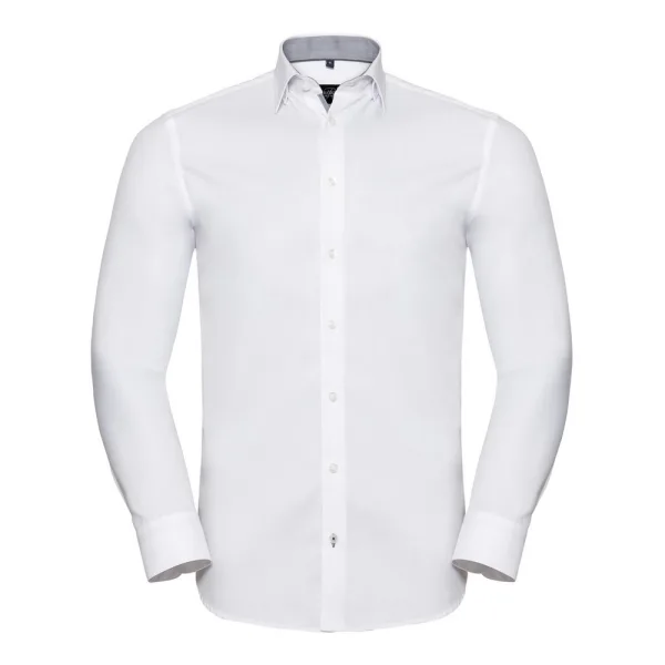 Materiaal: 84% katoen, 16% polyester. Gemakkelijk te onderhouden stof. Getailleerde pasvorm. Verborgen knoopsluiting met contrasterende binnenzijde. Rugdarts. Zelfkleurige knoppen. Afgeronde twee knoopsverstelbare manchetten met contrasterende binnenzijde. Contrasterende randen rond de onderste knoopsluiting. Gebogen zoom. WRAP gecertificeerde productie. Maten worden vermeld op kraagmaat.