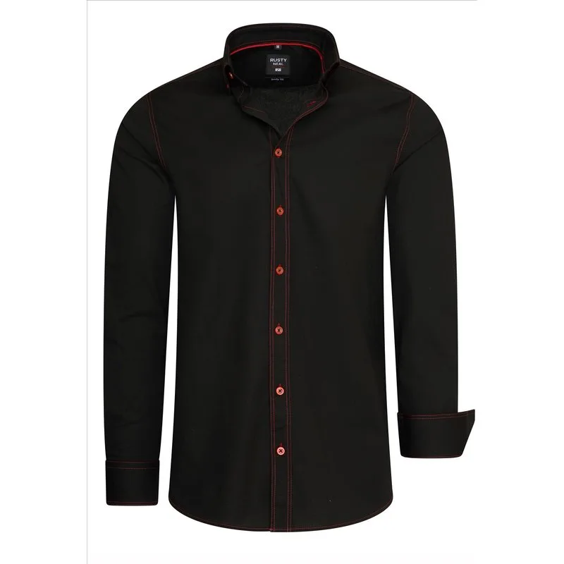 Heren overhemd met hoge boord van het Italian Style Merk Rusty Neal. De heren overhemden hebben een casual en net design. Je kunt deze Moda Italia overhemden voor mannen prima combineren op je chino, pantalon of jeans. De heren blouse is gemaakt van hoogwaardige katoenen met lichte stretch. Ervaar zelf het draagcomfort van deze overhemden. Materiaal: 97% katoen, 3% Lycra Pasvorm: Normal fit Kleur: Zwart - Rood
