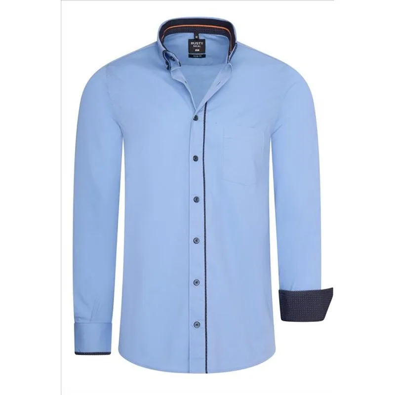 Blauw effen heren overhemd met hoge boord van het Merk Rusty Neal. Deze Italiaanse heren overhemden hebben een zakelijke uitstraling, maar zijn ook zeer geschikt als vrijetijdskleding. De Moda Italia blouse voor mannen heeft een klein patroon in de kraag. Tevens vind je dit patroon in de manchet terug. Materiaal: 97% katoen, 3% Lycra Pasvorm: Normal fit Kleur : Blauw