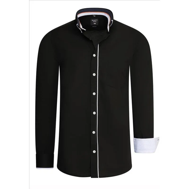 Zwart effen heren overhemd met hoge boord van het Merk Rusty Neal. Deze Italiaanse heren overhemden hebben een zakelijke uitstraling, maar zijn ook zeer geschikt als vrijetijdskleding. De Moda Italia blouse voor mannen heeft een klein patroon in de kraag. Tevens vind je dit patroon in de manchet terug. Materiaal: 97% katoen, 3% Lycra Pasvorm: Normal fit Kleur : Zwart