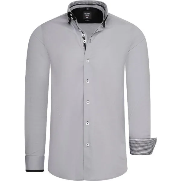 Grijs heren overhemd van het Merk Rusty Neal. Deze Italiaanse overhemden met dubbele kraag hebben een zakelijke uitstraling, maar zijn ook zeer geschikt als vrijetijdskleding. De blouse voor mannen is voorzien van een fijn patroon in de binnenboord. Ook is de binnenkant van de manchet voorzien van een fijn motief. Tevens zijn de knopen van de blouse zwart van kleur. Materiaal: 97% katoen, 3% Lycra Kleur: Grijs Merk: Rusty Neal Fit: Regular fit
