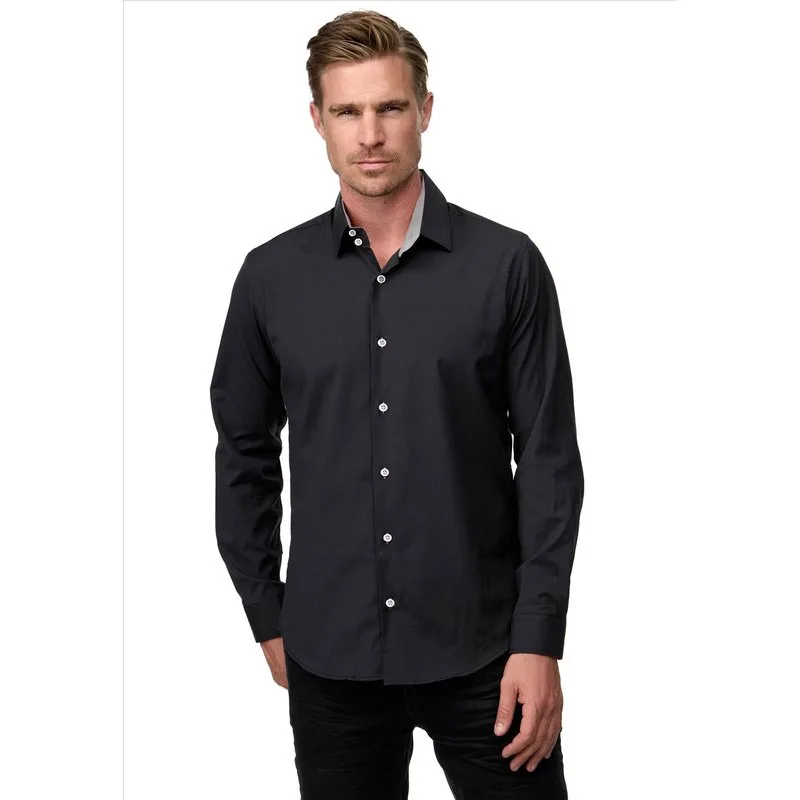 Heren overhemd van het merk Rusty Neal. Deze nette slim fit overhemden voor mannen hebben een zakelijke uitstraling, maar zijn ook zeer geschikt als vrijetijdskleding. Het effen zwarte basic overhemd heeft een slim fit pasvorm. Tevens is de blouse voorzien van een grijze kraag en grijze knopen. Je kunt het overhemd voor mannen goed combineren in je outfit met een chino, pantalon of een jeans. Materiaal: 60% katoen, 37% Polyester, 3% Elastan Kleur: Zwart grijs
