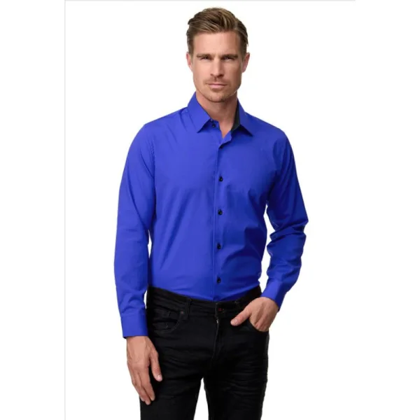 Blauw heren overhemd. Deze nette slim fit overhemden hebben een zakelijke uitstraling, maar zijn ook zeer geschikt als vrijetijdskleding. Het Italian Style overhemd heeft een slim fit pasvorm. Tevens is de effen heren blouse voorzien van een zwarte boord en zwarte knopen. Je kunt dit overhemd prima combineren met een jeans, chino of pantalon. Materiaal: 60% katoen, 37% Polyester, 3% Elastan Kleur: Kobalt blauw Pasvorm: Slim fit