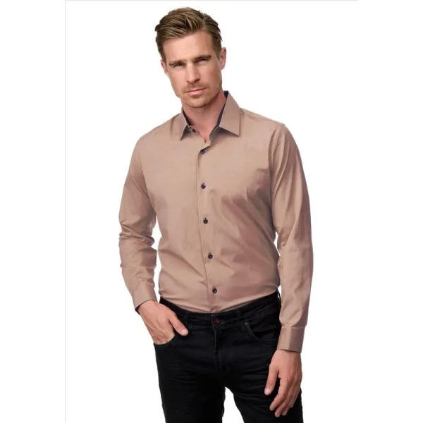 Heren overhemd Beige van het Moda Italia merk Rusty Neal. Deze nette slim fit overhemden hebben een zakelijke uitstraling, maar zijn ook zeer geschikt als vrijetijdskleding. Het basic heren overhemd voor mannen heeft een slim fit pasvorm. Het Moda Italia overhemd is voorzien van een zwarte binnenboord. Ook is de binnenkant van de manchet zwart van kleur. Tevens zijn de knopen van de blouse zwart. Materiaal: 60% katoen, 37% Polyester, 3% Elastan Kleur: Beige - Bruin