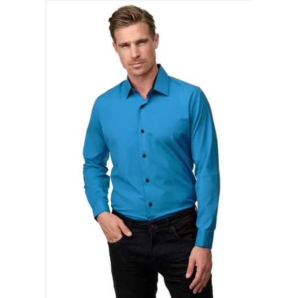 Heren overhemd van het merk Rusty Neal. Deze nette slim fit overhemden hebben een zakelijke uitstraling, maar zijn ook zeer geschikt als vrijetijdskleding. Het basic heren overhemd voor mannen heeft een slim fit pasvorm. Het overhemd is voorzien van een zwarte binnenboord. Ook is de binnenkant van de manchet zwart van kleur. Tevens zijn de knopen van de blouse zwart. Materiaal: 60% katoen, 37% Polyester, 3% Elastan Kleur: Petrol blauw Pasvorm: Slim fit