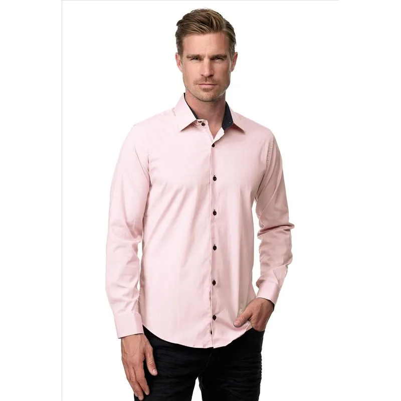 Roze heren overhemd van Rusty Neal. Deze nette slim fit overhemden hebben een zakelijke uitstraling, maar zijn ook zeer geschikt als vrijetijdskleding. Het roze effen basic overhemd voor mannen heeft een slim fit pasvorm. De heren blouse is voorzien van een zwarte binnenboord en zwarte knopen. Je kunt het overhemd voor mannen goed combineren in je outfit met een chino of een jeans. Materiaal: 60% katoen, 37% Polyester, 3% Elastan Kleur: Roze Pasvorm: Slim fit