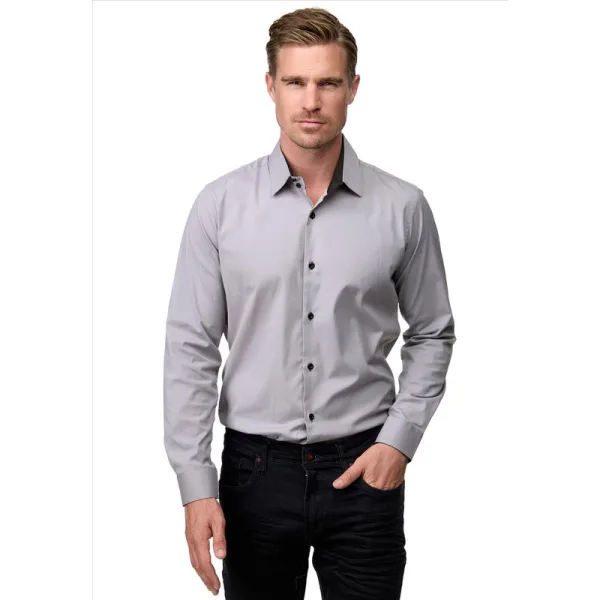 Grijs heren overhemd. Deze nette slim fit overhemden hebben een zakelijke uitstraling, maar ook is het Italian Style overhemd zeer geschikt als vrijetijdskleding. Het grijze effen Moda Italia overhemd heeft een slim fit pasvorm. De blouse voor mannen is voorzien van een zwarte binnenboord en zwarte knopen. Materiaal: 60% katoen, 37% Polyester, 3% Elastan Kleur: Grijs zwart Pasvorm: Slim Fit
