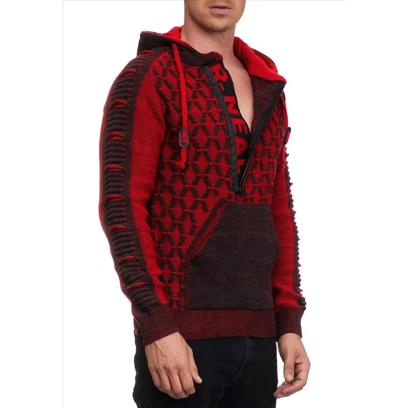 Stoere Trui / Hoodie voor heren van het stijlvolle Italie Moda merk Rusty Neal. Deze gebreide heren trui met capuchon heeft een nette uitstraling, maar is ook zeer geschikt als casual look. - Pasvorm: Modern Fit - Materiaal: 75% Polyacryl, 25% katoen - Kleur: Rood / Antraciet