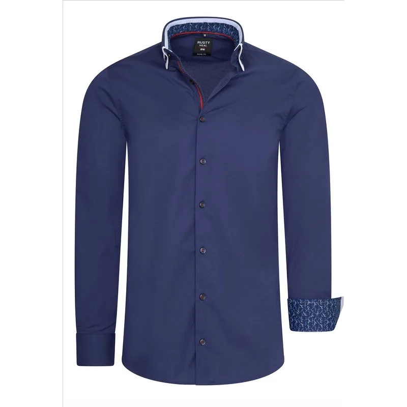 Marine blauw effen heren overhemd met dubbele boord van het Merk Rusty Neal. Deze Italiaanse overhemden hebben een zakelijke uitstraling, maar zijn ook zeer geschikt als vrijetijdskleding. De blouse voor mannen heeft een klein patroon in de dubbele kraag. Tevens vind je dit patroon in de manchet terug. Materiaal: 97% katoen, 3% Lycra Pasvorm: Normal fit Kleur : Marine / Blauw
