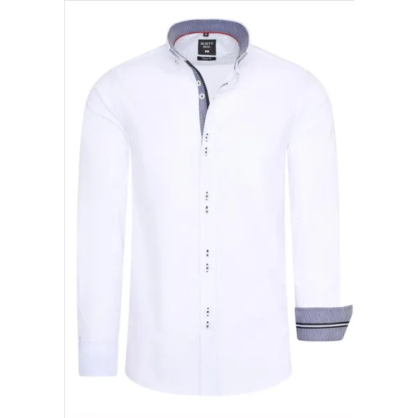 Heren overhemd met hoge boord van het Italia Style Merk Rusty Neal. Deze Italiaanse heren overhemden hebben een zakelijke uitstraling, maar zijn ook zeer geschikt als vrijetijdskleding. Je kunt deze overhemden prima combineren op je chino of jeans. De Moda Italia blouse voor mannen heeft een klein patroon in de kraag. Tevens vind je dit patroon in de manchet terug. Materiaal: 97% katoen, 3% Lycra Pasvorm: Normal fit Kleur : Wit