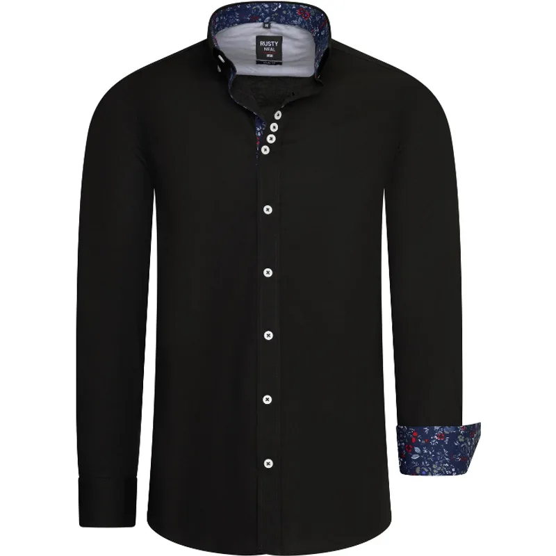 Zwart effen heren overhemd van het Moda Italia Merk Rusty Neal. Deze Italiaanse overhemden hebben een zakelijke uitstraling, maar zijn ook zeer geschikt als vrijetijdskleding. De blouse voor mannen heeft een gebloemd motief in de kraag ook vind je dit gebloemde patroon in de manchet terug. Tevens zijn de knopen transparant uitgevoerd. Materiaal: 97% katoen, 3% LycraPasvorm: Normal fit Kleur : Zwart