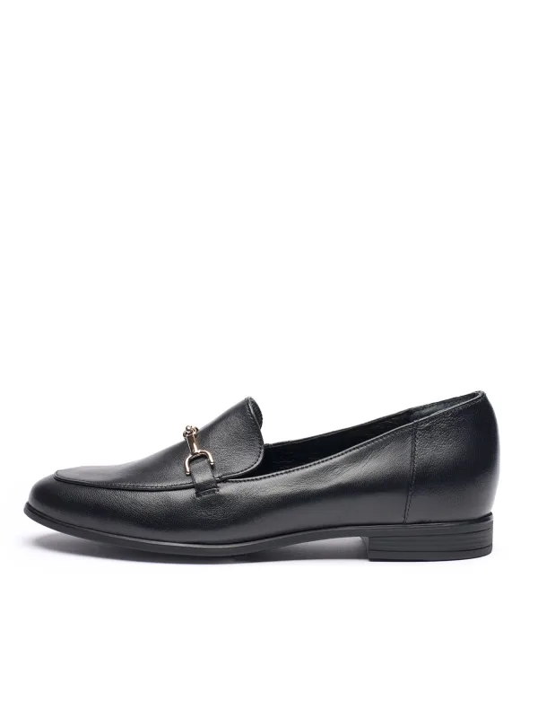 Deze zwarte instappers van leer uit de collectie Ryłko belichamen tijdloze elegantie. Gemaakt van natuurlijk glad leer, bieden ze een verzorgde uitstraling, compleet met een verfijnde gouden hardware. Het instapontwerp zorgt voor gemakkelijk dagelijks gebruik, terwijl de platte zool met een hak van 2 cm comfort en een lichte verhoging biedt. Van binnen zorgen de lederen voering en de binnenzool voor zachtheid en ademend vermogen. Afgewerkt met een ronde neus, zijn deze instappers een veelzijdige keuze die gemakkelijk te combineren is met casual, smart-casual en elegante outfits.